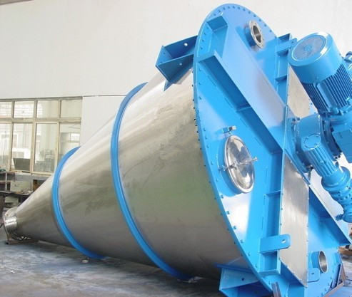 工作原理: DSH系列混合機筒內兩只非對稱螺旋自轉將 物料向上提升,轉臂慢速公轉運動;使螺旋外的物料,不同程度進入螺柱,從而達到全圓周方位物料的不斷更新擴散,被提到上部的兩股物料再向中心凹穴匯合,形 成一股向下的物料流,補充了底部的空缺,從而形成對流循環的三重混合效果。混合機兩非對稱螺旋的快速自轉,物料向上提升、形成兩股非對稱沿筒臂由下向上的 螺旋物料流。轉臂帶動的螺旋公轉運動,使螺旋外的物料不同程度進入螺柱包絡線內,一部分物料被錯位提升,另一部分物料被拋出螺柱,從而達到全圓周方位物料 的不斷更新擴散,被提到上部的兩股物料再向中心凹穴匯合,形成一股向下的物料流,補充了底部的空穴,從而形成對流循環。由于上述運動的復合,物料在較短時 間內獲得了均勻混合,混合程度較高。